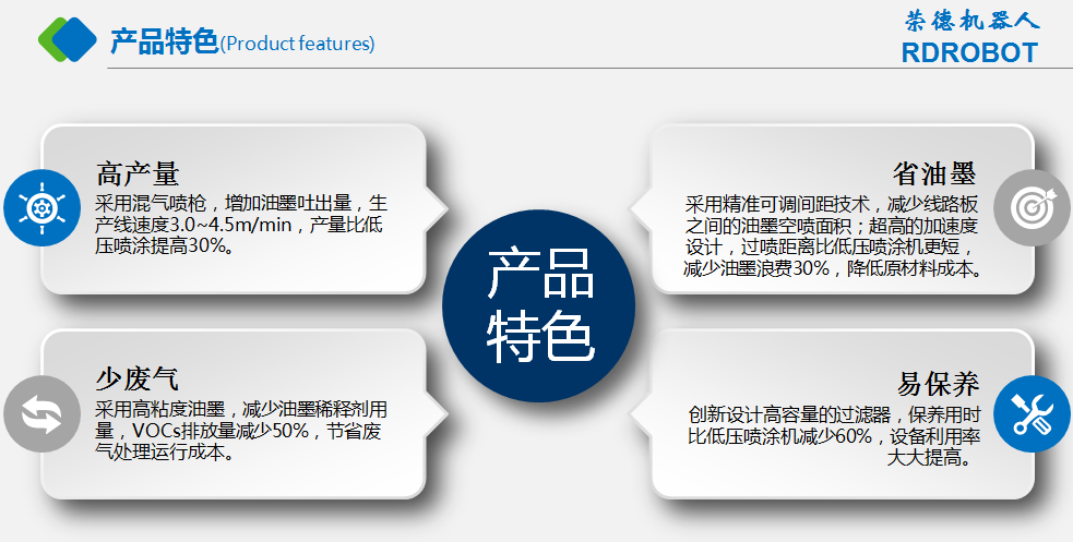 相比较低压喷涂技术,荣德新型的高速喷涂设备采用精准可调间距技术、高粘度供油系统、高速机械臂、干式过滤等先进技术,减少油墨过喷和空喷,产量较低压喷涂提高了30%。
